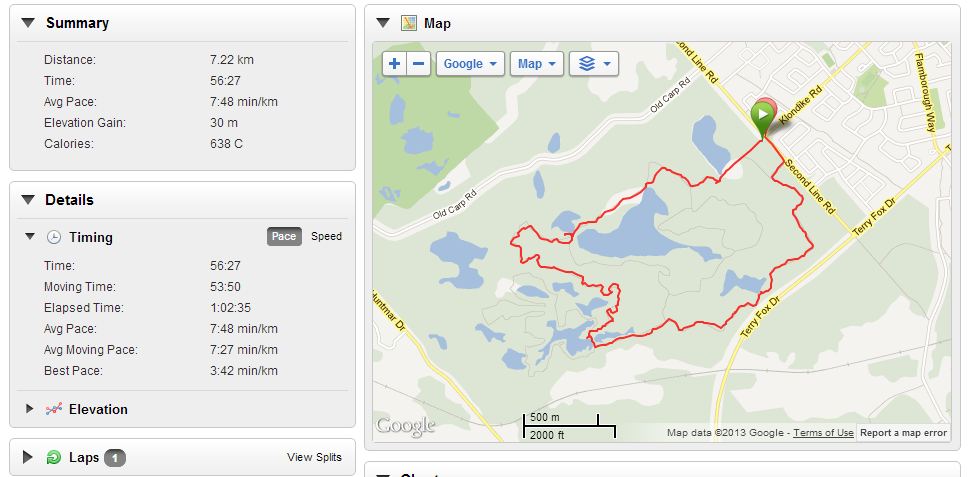 A few hours after the physio session I went for a 7.3 KM trail run with my running partner - it felt great. In fact it was so great I had to hop on my blog as soon as I got home and post this. The overall pace was pretty good but the return leg was near the training pace for our short runs from last year - and all seemed good during and after the run.